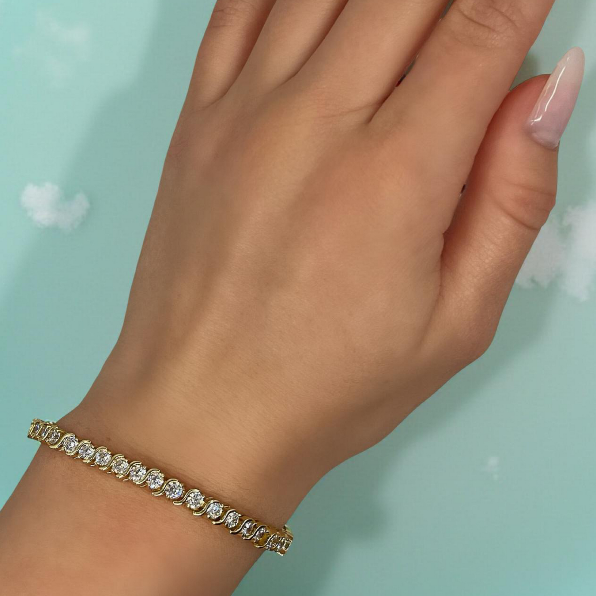 Gold and cubic zirconia s-curve tennis bracelet with classic box clasp. Elegant. Simple. Classic. Let it sparkle solo or stack alongside our Kat gold chain bracelet or Toni round bezel tennis bracelet.