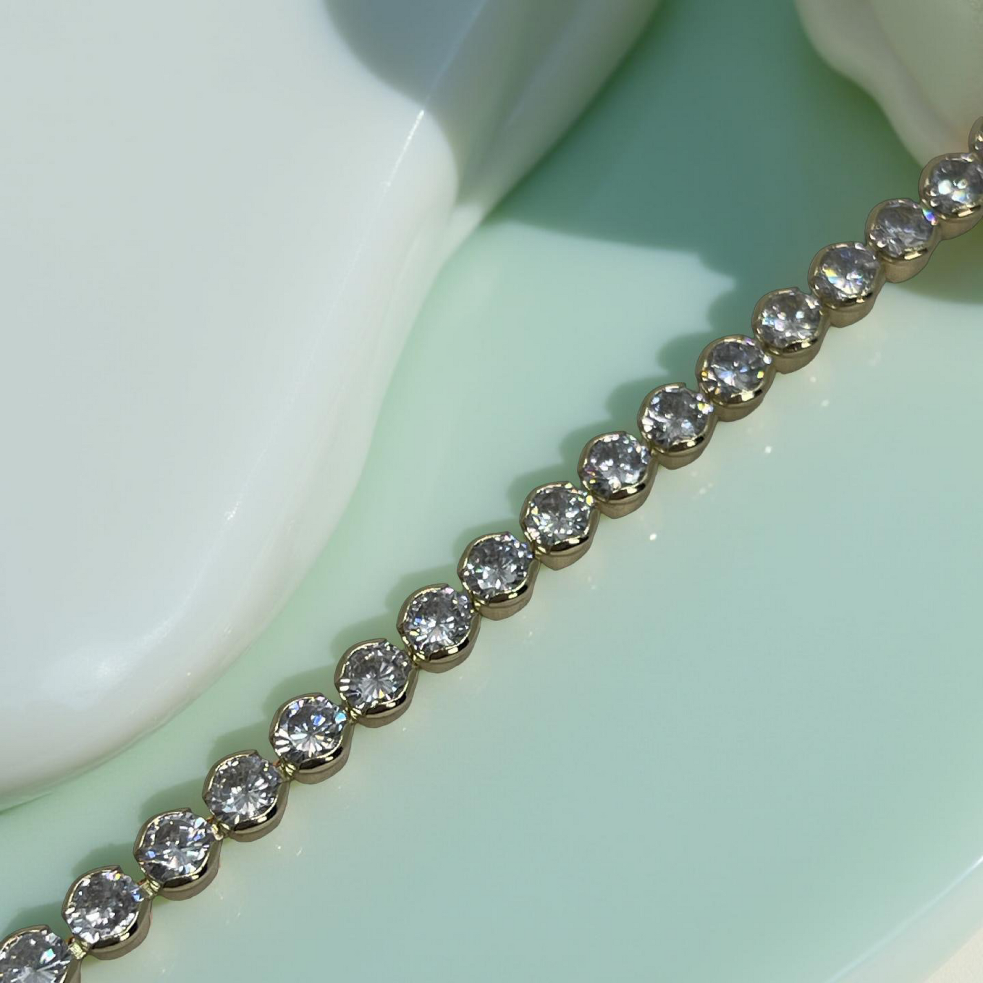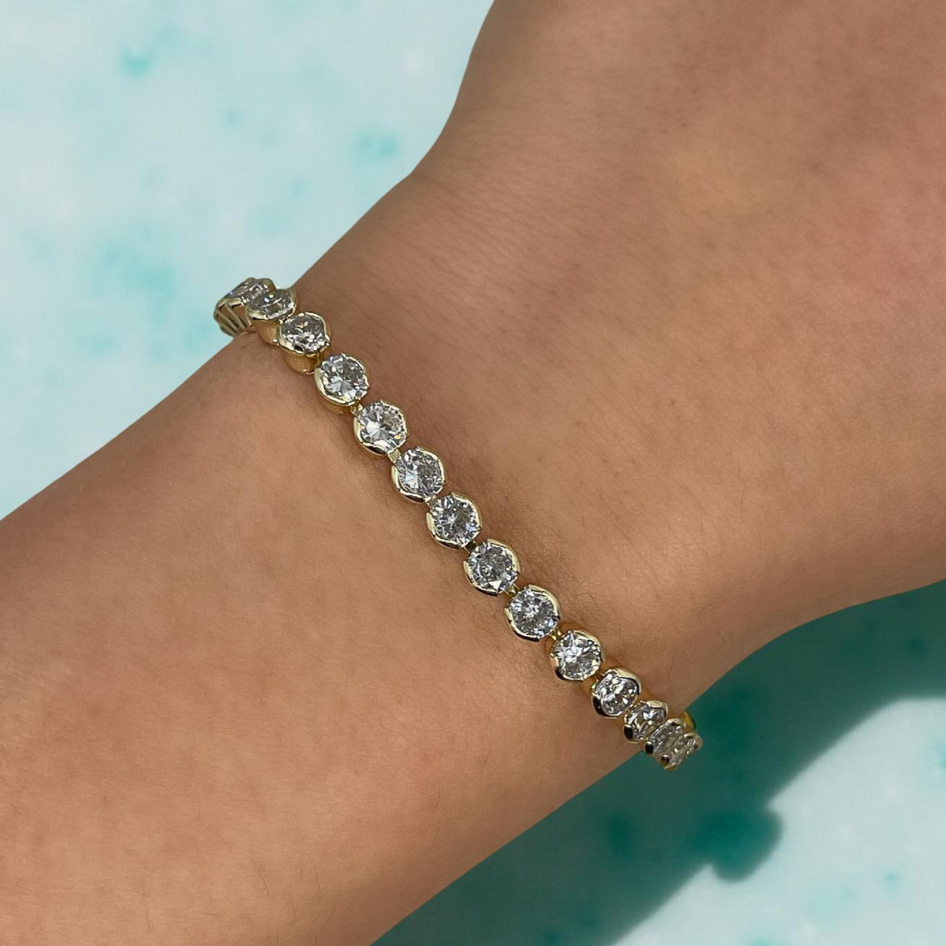 Chic round cz bezel gold tennis bracelet with elegant box clip closure. Wear solo for simple pared back elegance or style with other wrist chains and stoned bracelets for a maximalist style. Alternatively, double up your wrist sparkle with our Curve tennis bracelet.